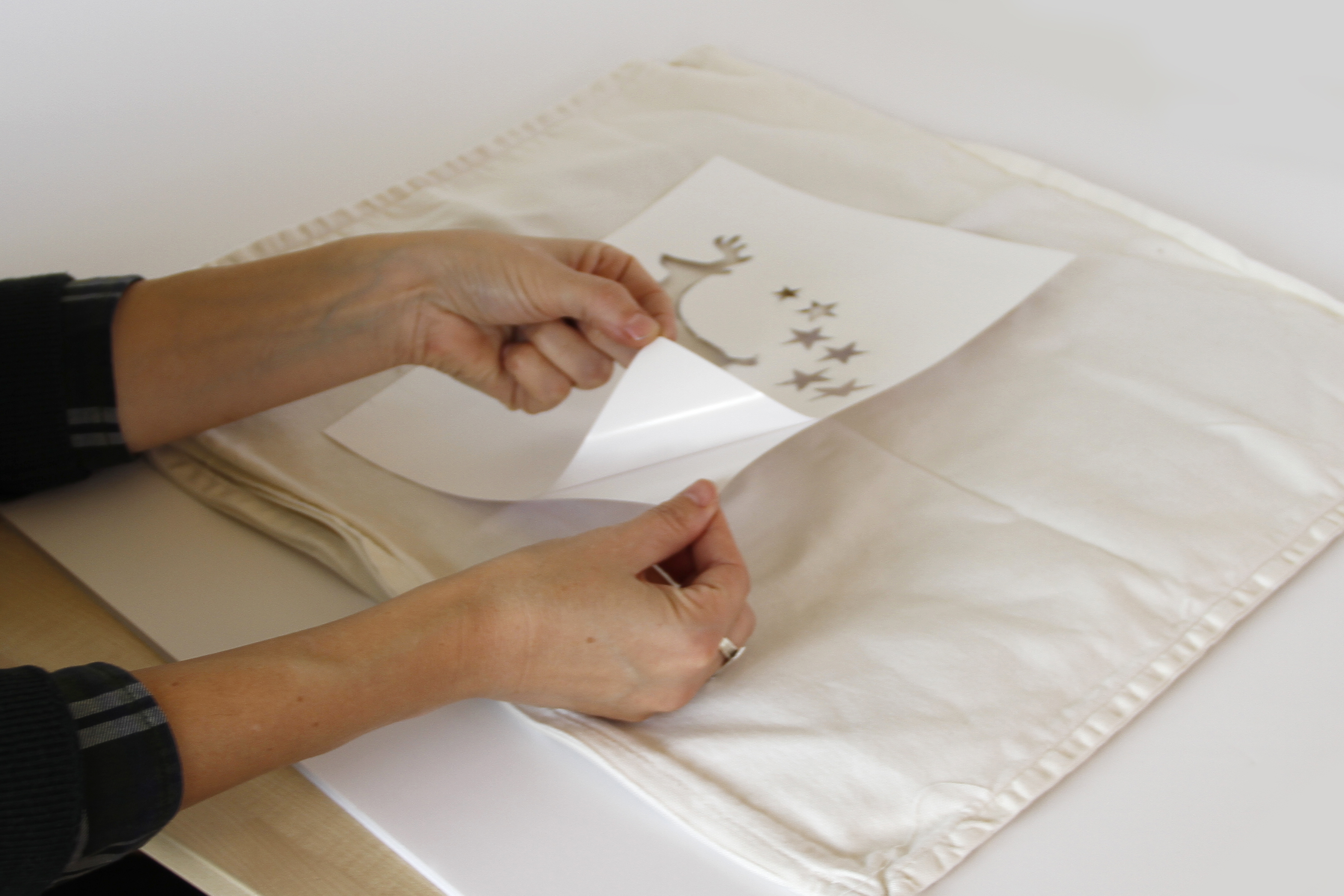 Pega la hoja adhesiva con el dibujo vaciado encima del cojín.