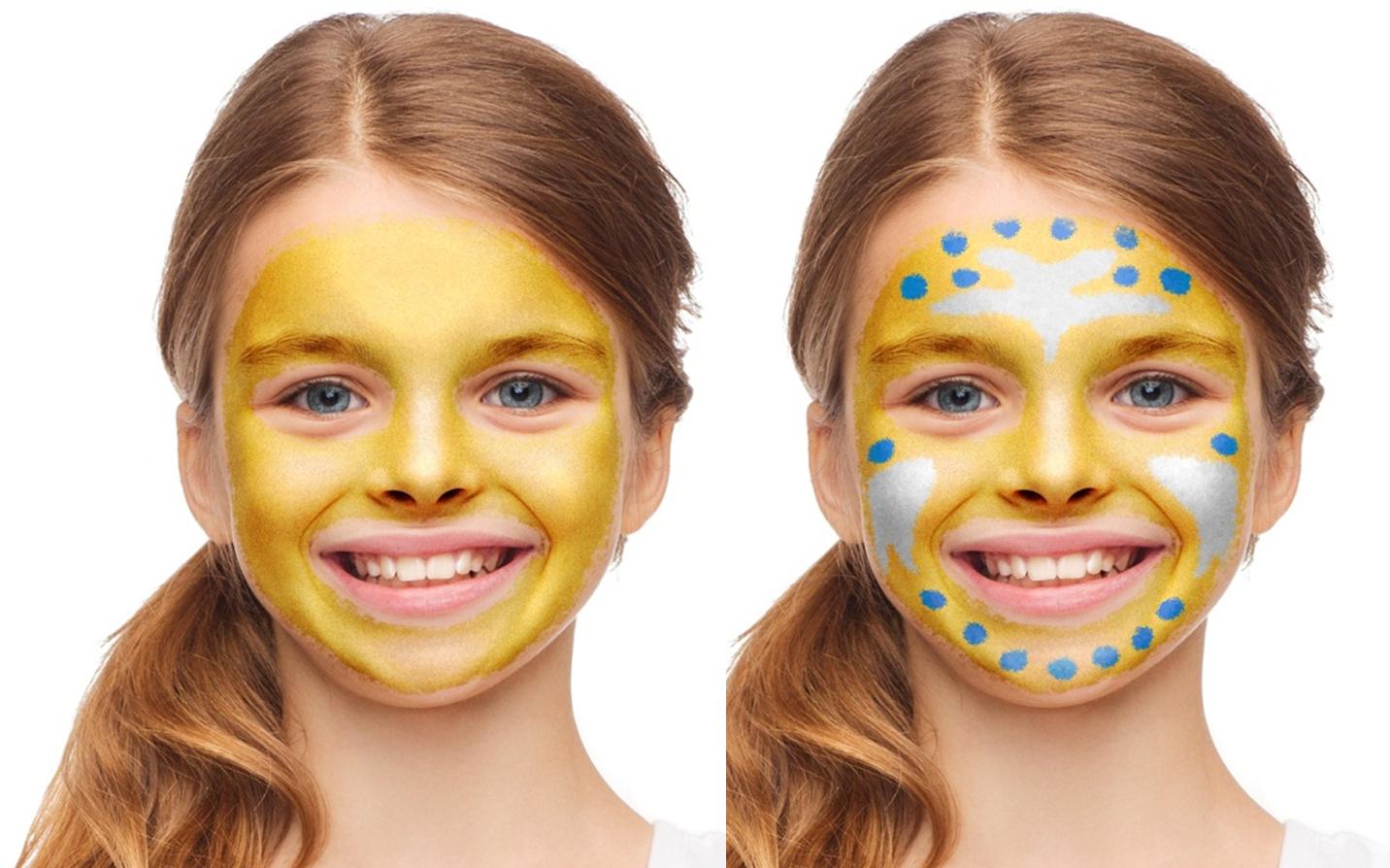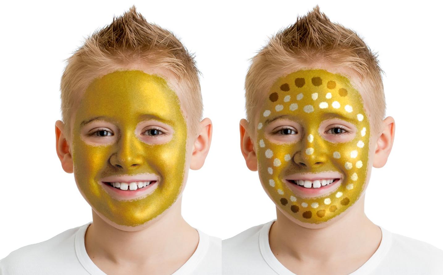 Cubre la totalidad del rostro con la barra de maquillaje metalizada de color oro. Con el maquillaje marrón y blanco crea los puntos.