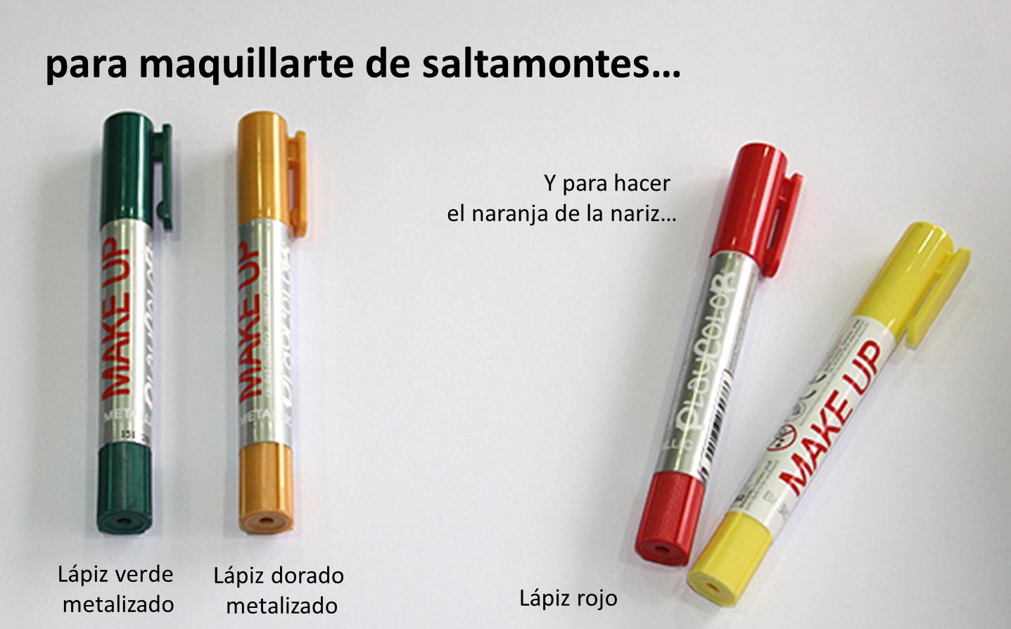 Pinta el fondo de tu cara, evitando la zona próxima a boca y ojos con la barra de maquillaje de color oro. Con el verde metalizado, traza las lineas del contorno, cómo se muestra en la imagen. Para hacer el naranja de la nariz, pintarla primero en rojo basic y luego con amarillo para conseguir la tonalidad.