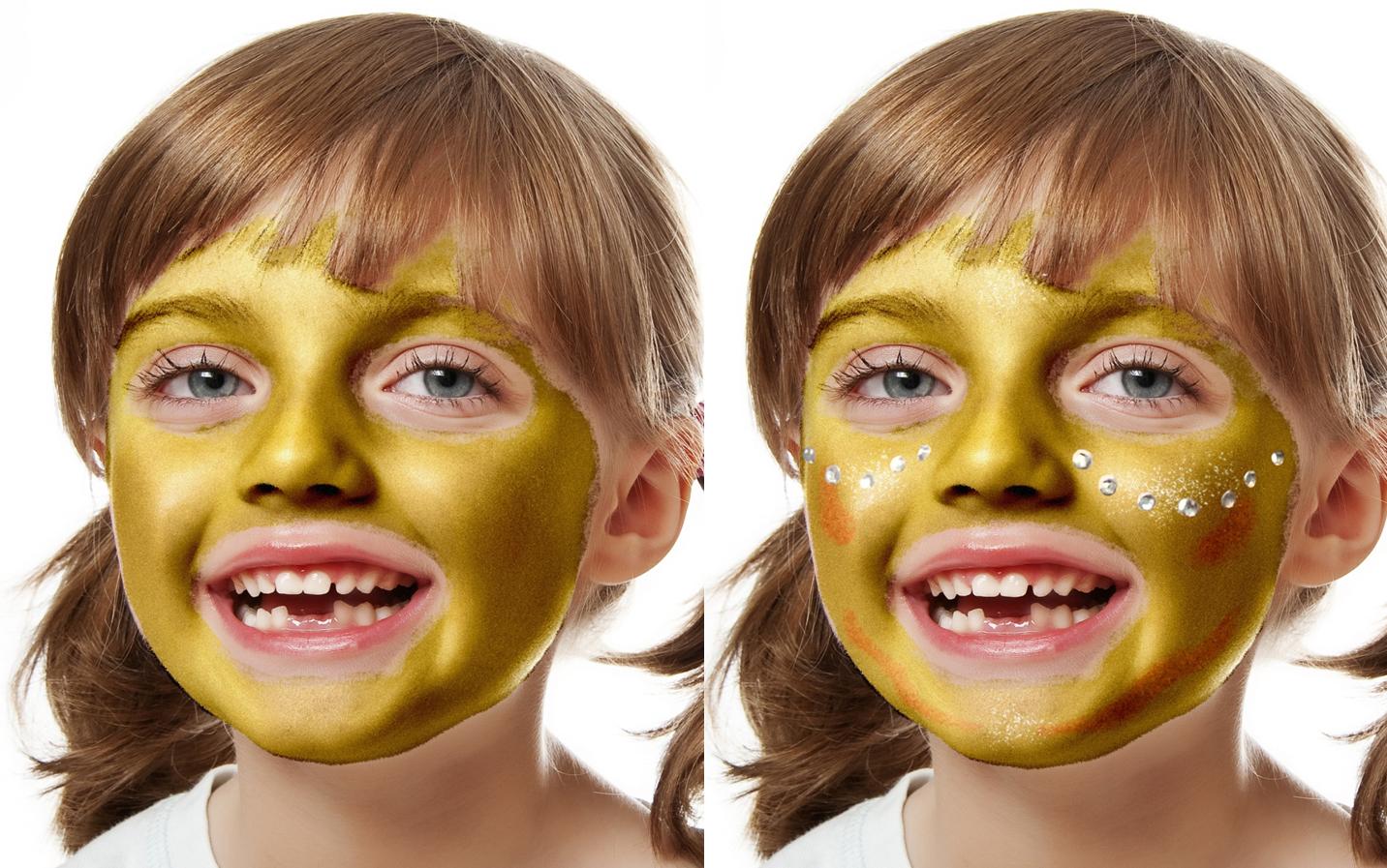 Maquilla la cara con maquillaje de color oro, evitando el contorno de boca y ojos. Añade algunos trazos de rojo en barbilla y majíllas. Dale el toque final con purpurina.