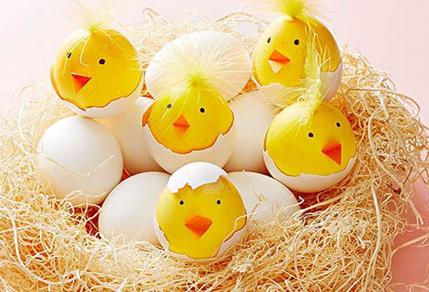 ¡El amarillo reluce en primavera! Y sin duda, también es la mejor opción para una decoración de pascua tradicional. Cubrid la base de los huevos con tempera solida PLAYCOLOR amarilla y después de secar pégales un trozo de pluma y el pico. Con un rotulador podéis acabar de hacerles los ojos.