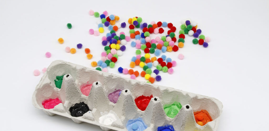 Tan fácil cómo reciclar una huevera de cartón y pintar los heuvos en diferentes tonalidades de PLAYCOLOR LIQÜID. El colorido del fondo y de los pompones de fieltro, lo convertirán en un recurso de gran vistosidad y atractivo para los más pequeños.